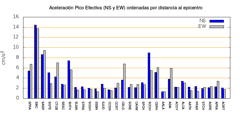 La siguiente tabla muestra los valores de aceleración efectiva para las componentes norte-sur (NS) y este-oeste (EW). También se muestra el valor del cociente entre la aceleración efectiva y la aceleración máxima (APE/PGA).