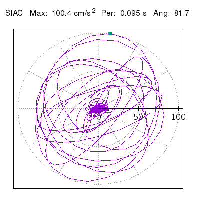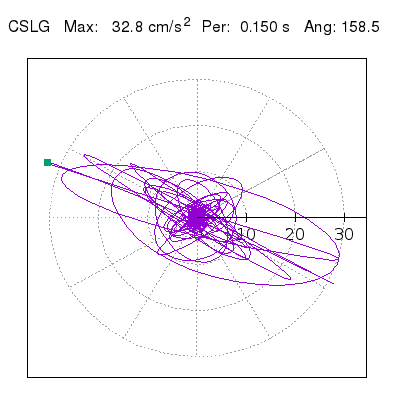 Tomando el periodo en el cual se presenta la amplitud máxima del espectro de respuesta máxima para cada estación, se representa la respuesta bidireccional en función del tiempo sobre el plano horizontal. Se identifica el punto (color verde en cada figura) del cual se desprende la orientación mostrada en el mapa de la sección superior. El valor de la acelereración máxima corresponde al punto del espectro de respuesta para el periodo indicado.