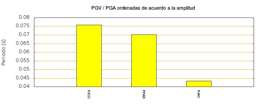 El cociente de la velocidad máxima (PGV) entre la aceleración máxima (PGA) brinda información de los periodos más significativos del movimiento del suelo. En el gráfico siguiente se muestran las estaciones ordenadas por su cercanía al epicentro. La más cercana está a la izquierda y la más lejana a la derecha. También se muestran los mismos datos en orden alfabético y ordenados de mayor a menor amplitud.