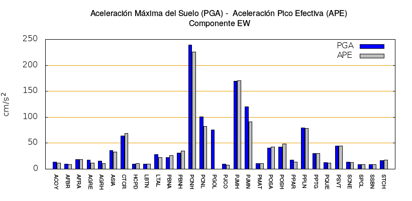 La siguiente tabla muestra los valores de aceleración efectiva para las componentes norte-sur (NS) y este-oeste (EW). También se muestra el valor del cociente entre la aceleración efectiva y la aceleración máxima (APE/PGA).