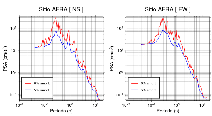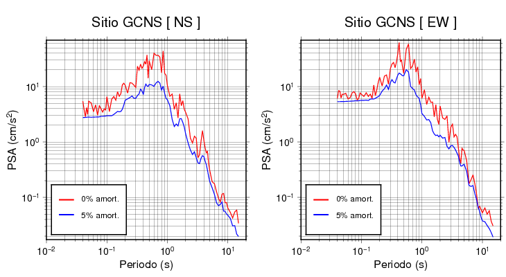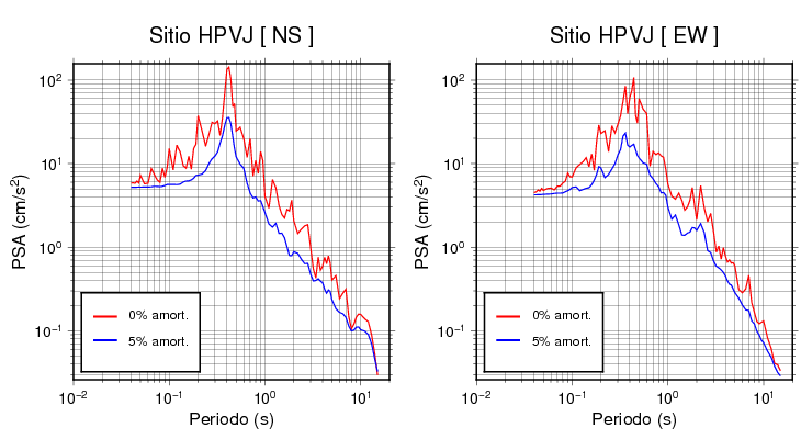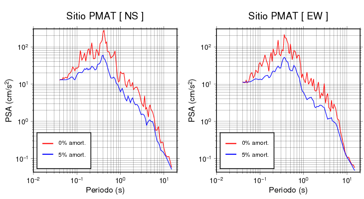 Las construcciones civiles generalmente poseen niveles de amortiguamiento en el rango de 2 a 7%. Para edificaciones normales, se asume que es de 5%. Esta tabla contiene los valores de PSA en cm/s2 calculados del espectro de respuesta con 5% de amortiguamiento a 1 segundo (se muestran los valores para aquellas estaciones que tuvieron un valor de aceleración superior a 5 cm/s2).