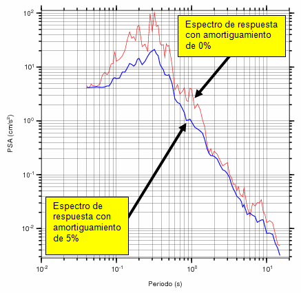 Los espectros de respuesta son unas curvas que se obtienen de los registros acelerográficos. Estas muestran el valor de la pseudoaceleración en función del periodo y le permiten al ingeniero calcular la fuerza sísmica. La forma de los espectros de diseño esta íntimamente ligada a la zona sísmica y el tipo de suelo donde se ubican las construcciones. Esta figura muestra un ejemplo de tales curvas: