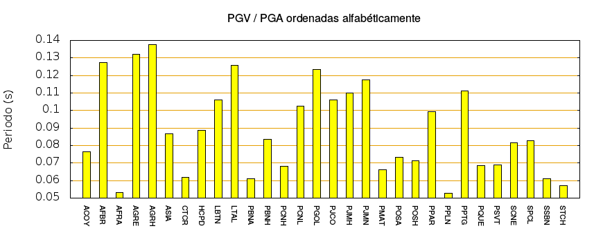 El cociente de la velocidad máxima (PGV) entre la aceleración máxima (PGA) brinda información de los periodos más significativos del movimiento del suelo. En el gráfico siguiente se muestran las estaciones ordenadas por su cercanía al epicentro. La más cercana está a la izquierda y la más lejana a la derecha. También se muestran los mismos datos en orden alfabético y ordenados de mayor a menor amplitud.