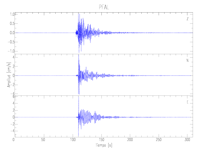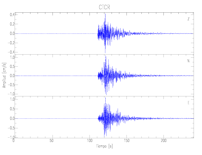 Los registros de velocidad se obtienen de la integración de los datos de aceleración. Esta tabla contiene los valores de velocidad máxima (PGV por sus siglas en inglés) para cada componente en cm/s. Las estaciones se listan en orden alfabético y corresponden a los sitios en que el nivel de aceleración fue superior a los 5 cm/s2.