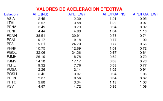 La siguiente tabla muestra los valores de aceleración efectiva para las componentes norte-sur (NS) y este-oeste (EW). También se muestra el valor del cociente entre la aceleración efectiva y la aceleración máxima (APE/PGA).