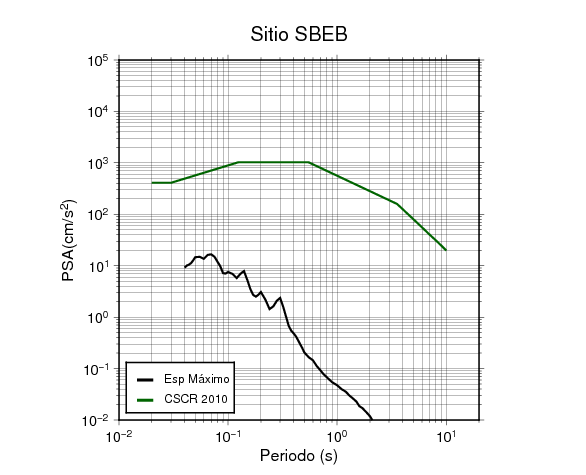 En los siguientes gráficos, la traza verde es el espectro propuesto por el CSCR-2010, la traza negra es el espectro máximo de este sismo. El valor de la amplitud está dado en pseudoaceleración en cm/s2.
