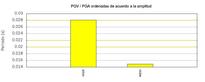 El cociente de la velocidad máxima (PGV) entre la aceleración máxima (PGA) brinda información de los periodos más significativos del movimiento del suelo. En el gráfico siguiente se muestran las estaciones ordenadas por su cercanía al epicentro. La más cercana está a la izquierda y la más lejana a la derecha. También se muestran los mismos datos en orden alfabético y ordenados de mayor a menor amplitud.
