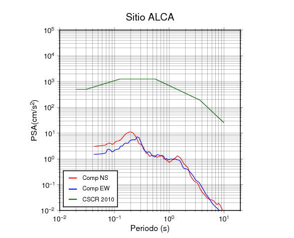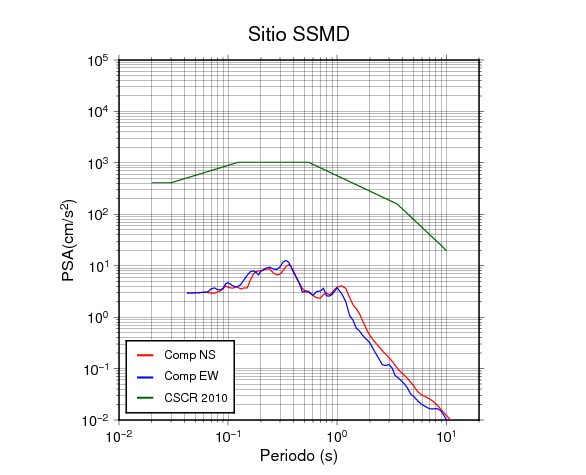 En los siguientes gráficos, la traza verde es el espectro propuesto por el CSCR-2010, la traza roja es el espectro de este sismo en la componente norte-sur (NS) y la traza azul la componente este-oeste (EW). El valor de la amplitud está dado en pseudoaceleración en cm/s2.