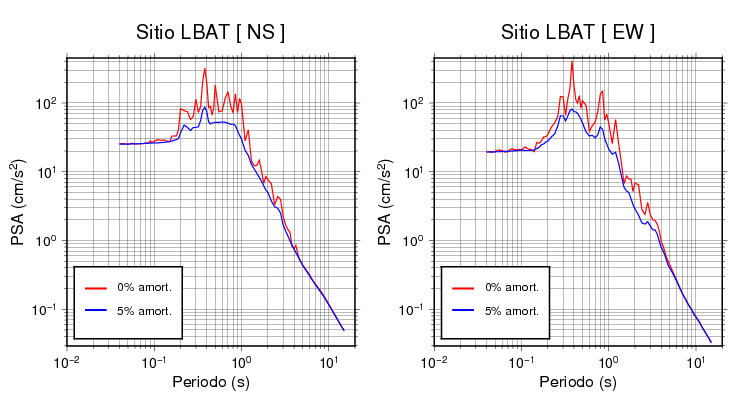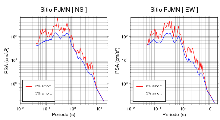Las construcciones civiles generalmente poseen niveles de amortiguamiento en el rango de 2 a 7%. Para edificaciones normales, se asume que es de 5%. Esta tabla contiene los valores de PSA en cm/s2 calculados del espectro de respuesta con 5% de amortiguamiento a 1 segundo (se muestran los valores para aquellas estaciones que tuvieron un valor de aceleración superior a 5 cm/s2).