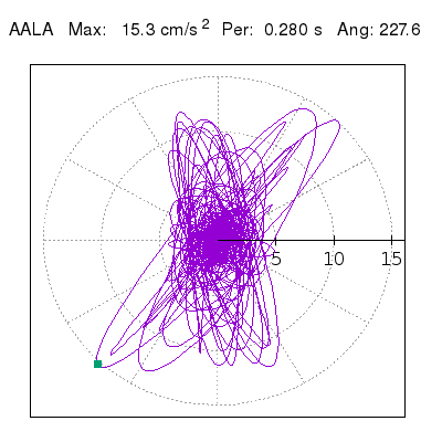 Tomando el periodo en el cual se presenta la amplitud máxima del espectro de respuesta máxima para cada estación, se representa la respuesta bidireccional en función del tiempo sobre el plano horizontal. Se identifica el punto (color verde en cada figura) del cual se desprende la orientación mostrada en el mapa de la sección superior. El valor de la acelereración máxima corresponde al punto del espectro de respuesta para el periodo indicado.
