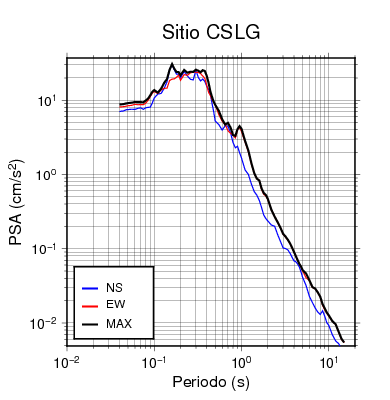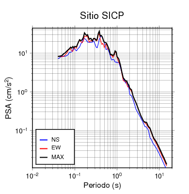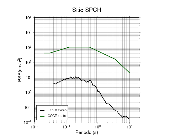 En los siguientes gráficos, la traza verde es el espectro propuesto por el CSCR-2010, la traza negra es el espectro máximo de este sismo. El valor de la amplitud está dado en pseudoaceleración en cm/s2.