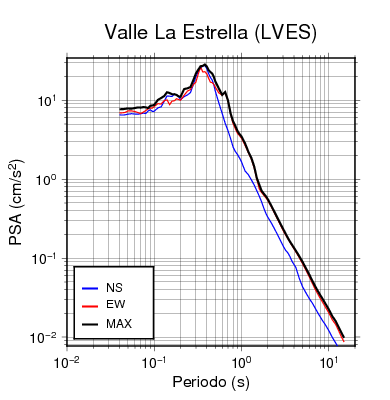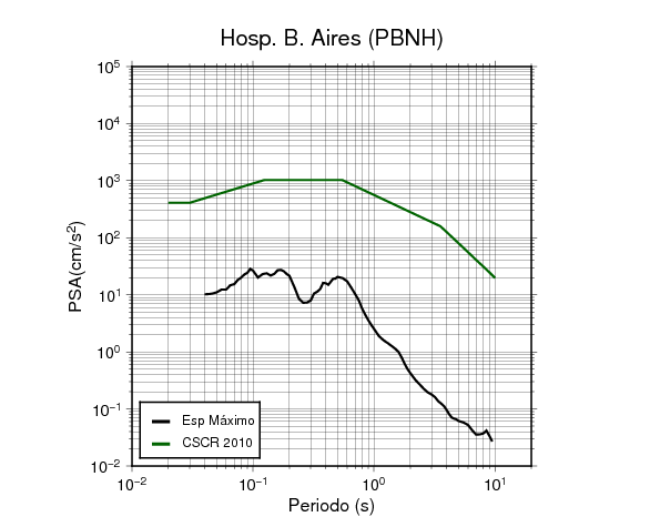 En los siguientes gráficos, la traza verde es el espectro propuesto por el CSCR-2010, la traza negra es el espectro máximo de este sismo. El valor de la amplitud está dado en pseudoaceleración en cm/s2.
