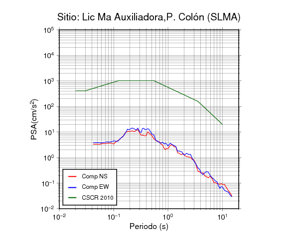En los siguientes gráficos, la traza verde es el espectro propuesto por el CSCR-2010, la traza roja es el espectro de este sismo en la componente norte-sur (NS) y la traza azul la componente este-oeste (EW). El valor de la amplitud está dado en pseudoaceleración en cm/s2.
