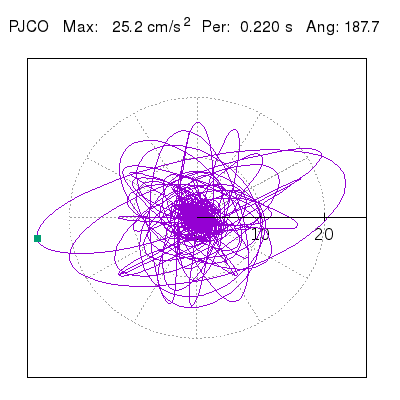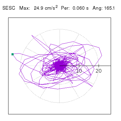 Tomando el periodo en el cual se presenta la amplitud máxima del espectro de respuesta máxima para cada estación, se representa la respuesta bidireccional en función del tiempo sobre el plano horizontal. Se identifica el punto (color verde en cada figura) del cual se desprende la orientación mostrada en el mapa de la sección superior. El valor de la acelereración máxima corresponde al punto del espectro de respuesta para el periodo indicado.