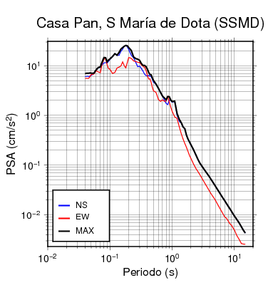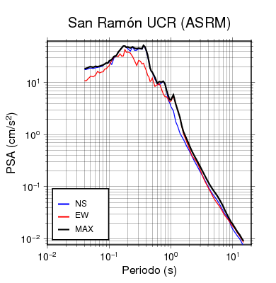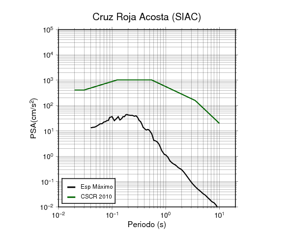 En los siguientes gráficos, la traza verde es el espectro propuesto por el CSCR-2010, la traza negra es el espectro máximo de este sismo. El valor de la amplitud está dado en pseudoaceleración en cm/s2.