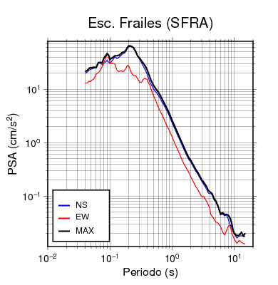 Los espectros de respuesta máxima siempre serán mayores o iguales a los espectros en las direcciones N-S y E-O. Se muestra la comparación para cada una de las estaciones en que se registró el evento.
