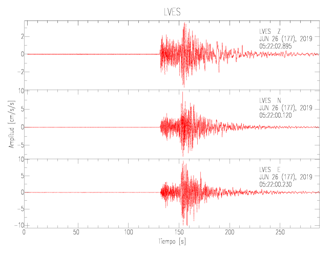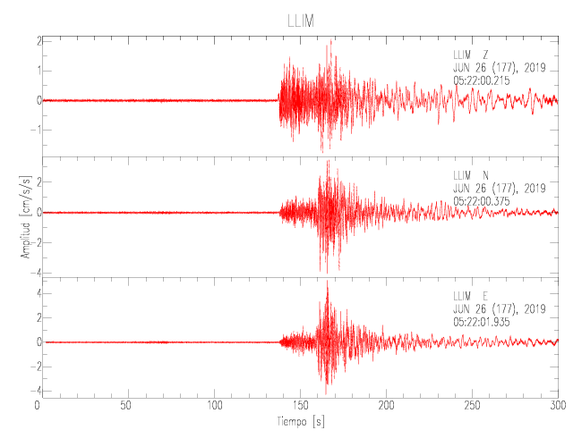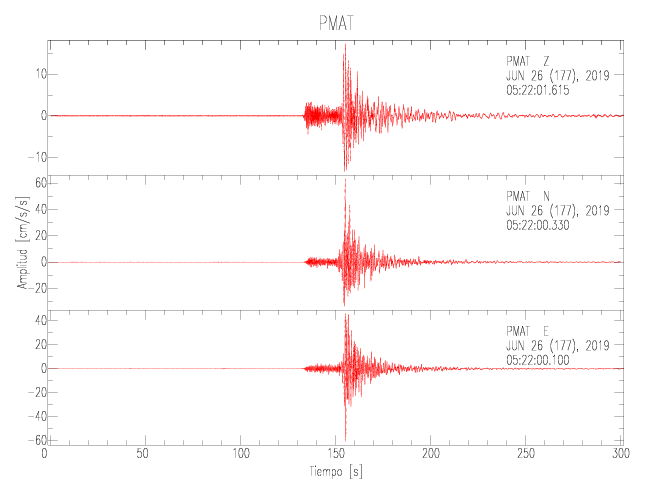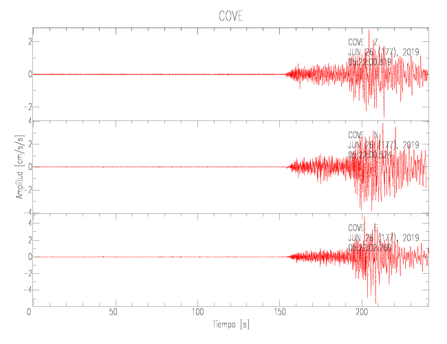 La siguiente tabla muestra los datos de aceleración máxima para cada componente en porcentaje de la aceleración de la gravedad (%g). Estos se obtienen dividiendo el valor del PGA registrado por 980 cm/s2 y multiplicándolo por 100. Las estaciones se listan en orden alfabético. Los valores de las últimas dos columnas corresponden a la componente radial y transversal.