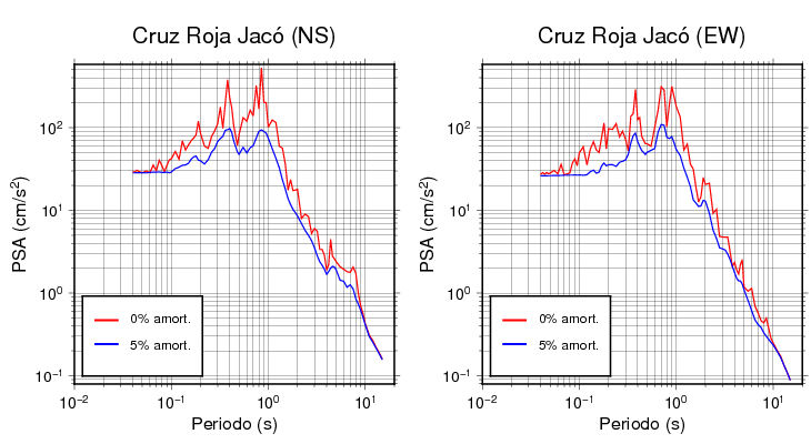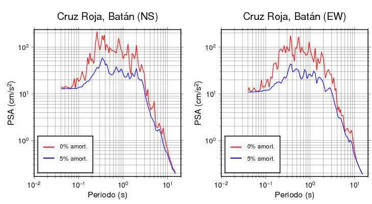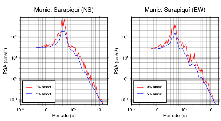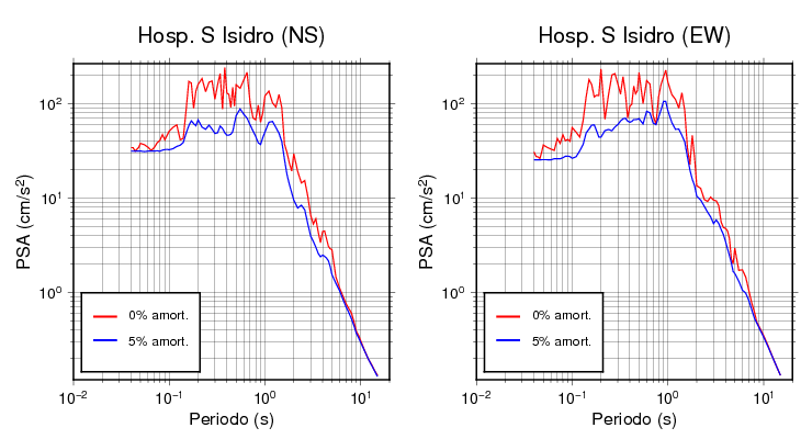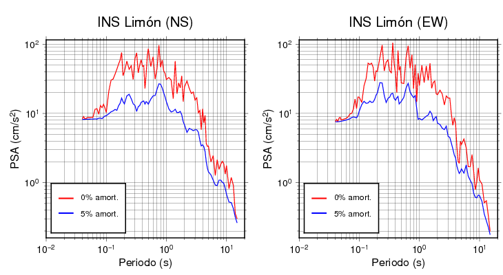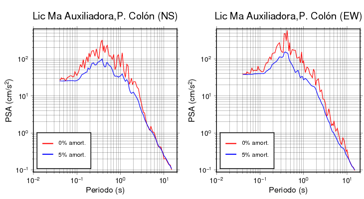 Las construcciones civiles generalmente poseen niveles de amortiguamiento en el rango de 2 a 7%. Para edificaciones normales, se asume que es de 5%. Esta tabla contiene los valores de PSA en cm/s2 calculados del espectro de respuesta con 5% de amortiguamiento a 1 segundo (se muestran los valores para aquellas estaciones que tuvieron un valor de aceleración superior a 5 cm/s2).
