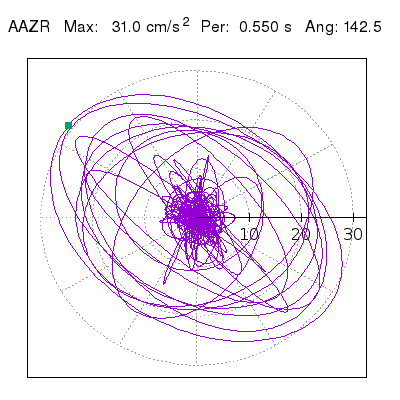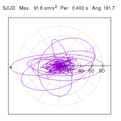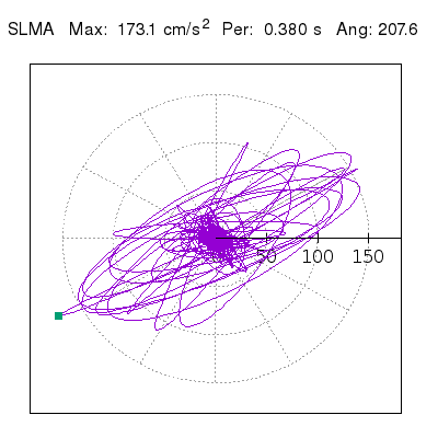 Tomando el periodo en el cual se presenta la amplitud máxima del espectro de respuesta máxima para cada estación, se representa la respuesta bidireccional en función del tiempo sobre el plano horizontal. Se identifica el punto (color verde en cada figura) del cual se desprende la orientación mostrada en el mapa de la sección superior. El valor de la acelereración máxima corresponde al punto del espectro de respuesta para el periodo indicado.
