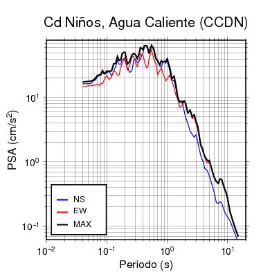 Los espectros de respuesta máxima siempre serán mayores o iguales a los espectros en las direcciones N-S y E-O. Se muestra la comparación para cada una de las estaciones en que se registró el evento.