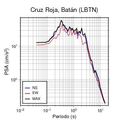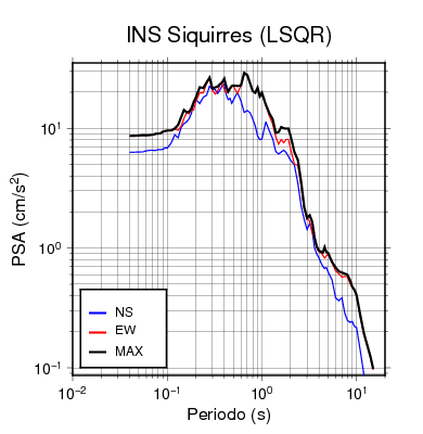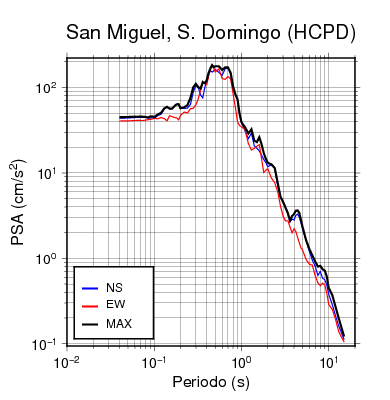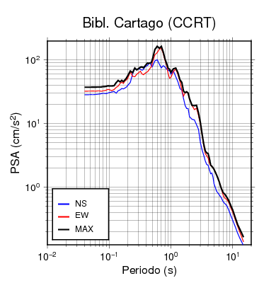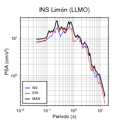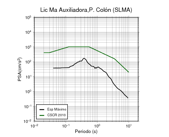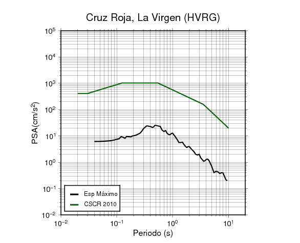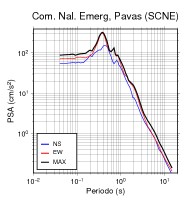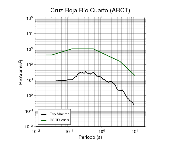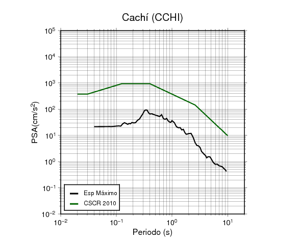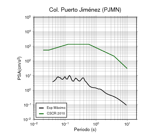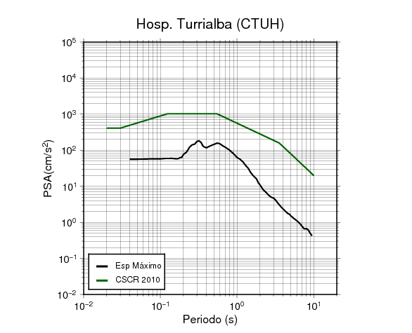 En los siguientes gráficos, la traza verde es el espectro propuesto por el CSCR-2010, la traza negra es el espectro máximo de este sismo. El valor de la amplitud está dado en pseudoaceleración en cm/s2.