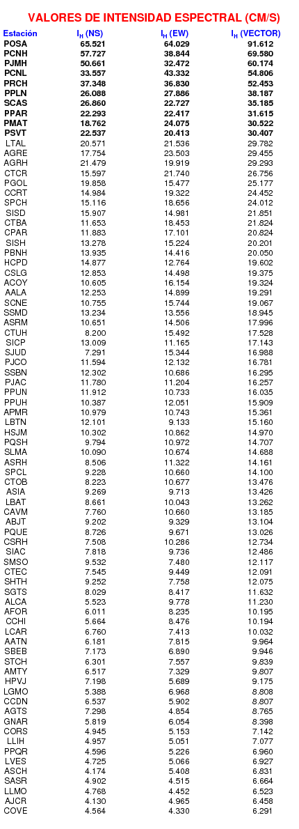 En esta sección se muestra el cáculo de la intensidad de Housner, IH para la componente norte-sur (NS) y este-oeste (EW) y la suma vectorial de los registros de aceleración que tuvieron valores superiores a los 5 cm/s2.