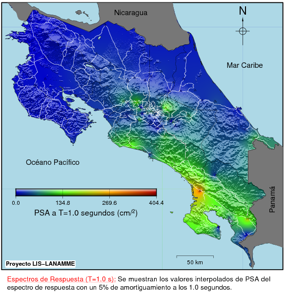 La siguiente figura corresponde al mapa interpolado de los valores de los espectros de respuesta para 1.0 s en período. La escala muestra los valores de pseudoaceleración con los valores bajos en azul y los altos en rojo. Los triángulos corresponden a la ubicación de los acelerógrafos.