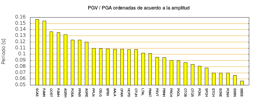El cociente de la velocidad máxima (PGV) entre la aceleración máxima (PGA) brinda información de los periodos más significativos del movimiento del suelo. En el gráfico siguiente se muestran las estaciones ordenadas por su cercanía al epicentro. La más cercana está a la izquierda y la más lejana a la derecha. También se muestran los mismos datos en orden alfabético y ordenados de mayor a menor amplitud.