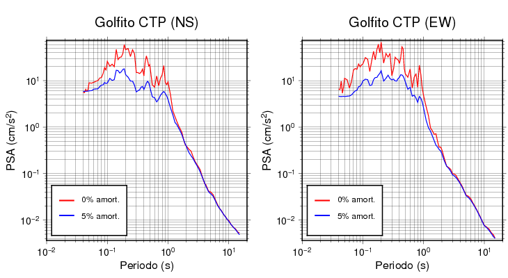 Las construcciones civiles generalmente poseen niveles de amortiguamiento en el rango de 2 a 7%. Para edificaciones normales, se asume que es de 5%. Esta tabla contiene los valores de PSA en cm/s2 calculados del espectro de respuesta con 5% de amortiguamiento a 1 segundo (se muestran los valores para aquellas estaciones que tuvieron un valor de aceleración superior a 5 cm/s2).