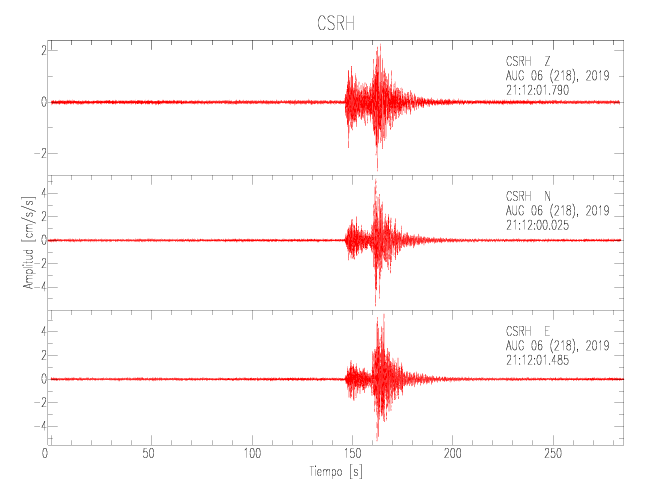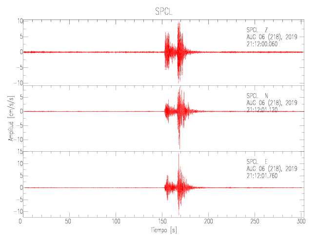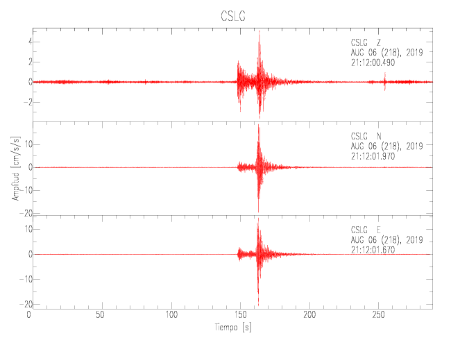 La siguiente tabla muestra los datos de aceleración máxima para cada componente en porcentaje de la aceleración de la gravedad (%g). Estos se obtienen dividiendo el valor del PGA registrado por 980 cm/s2 y multiplicándolo por 100. Las estaciones se listan en orden alfabético. Los valores de las últimas dos columnas corresponden a la componente radial y transversal.