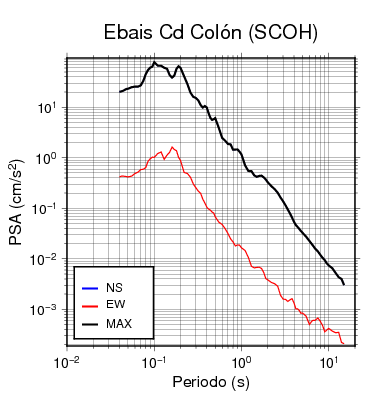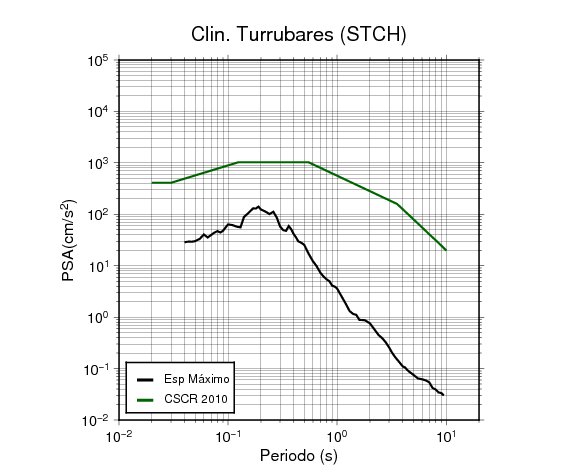 En los siguientes gráficos, la traza verde es el espectro propuesto por el CSCR-2010, la traza negra es el espectro máximo de este sismo. El valor de la amplitud está dado en pseudoaceleración en cm/s2.