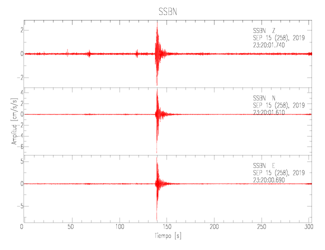 La siguiente tabla muestra los datos de aceleración máxima para cada componente en porcentaje de la aceleración de la gravedad (%g). Estos se obtienen dividiendo el valor del PGA registrado por 980 cm/s2 y multiplicándolo por 100. Las estaciones se listan en orden alfabético. Los valores de las últimas dos columnas corresponden a la componente radial y transversal.