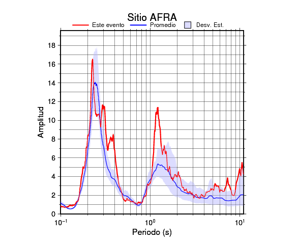 Los resultados que se presentan aquí fueron obtenidos luego de dividir las componentes horizontales entre la componente vertical (conocido como técnica H/V). Se grafica tanto el efecto de sitio del sismo registrado como el valor promedio en cada estación y su correspondiente desviación estándar.