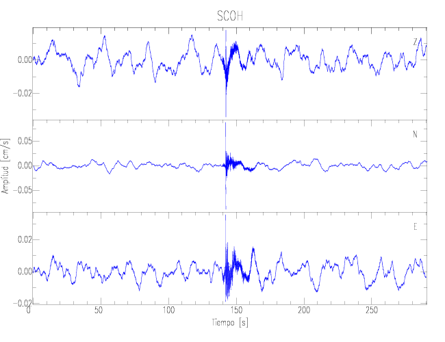 Los registros de velocidad se obtienen de la integración de los datos de aceleración. Esta tabla contiene los valores de velocidad máxima (PGV por sus siglas en inglés) para cada componente en cm/s. Las estaciones se listan en orden alfabético y corresponden a los sitios en que el nivel de aceleración fue superior a los 5 cm/s2.