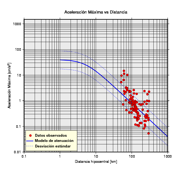 Datos del valor de la aceleración máxima (PGA por sus siglas en inglés) de cada estación (puntos rojos) en función de la distancia al hipocentro. Las trazas azules corresponden al modelo de atenuación y su respectiva desviación estándar.