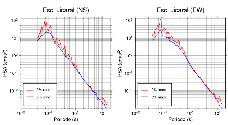 Las construcciones civiles generalmente poseen niveles de amortiguamiento en el rango de 2 a 7%. Para edificaciones normales, se asume que es de 5%. Esta tabla contiene los valores de PSA en cm/s2 calculados del espectro de respuesta con 5% de amortiguamiento a 1 segundo (se muestran los valores para aquellas estaciones que tuvieron un valor de aceleración superior a 5 cm/s2).