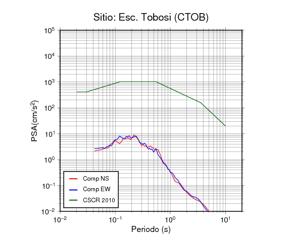 En los siguientes gráficos, la traza verde es el espectro propuesto por el CSCR-2010, la traza roja es el espectro de este sismo en la componente norte-sur (NS) y la traza azul la componente este-oeste (EW). El valor de la amplitud está dado en pseudoaceleración en cm/s2.