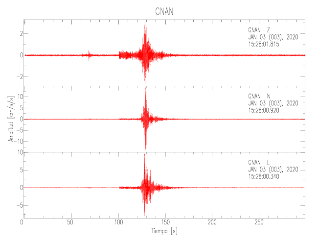 La siguiente tabla muestra los datos de aceleración máxima para cada componente en porcentaje de la aceleración de la gravedad (%g). Estos se obtienen dividiendo el valor del PGA registrado por 980 cm/s2 y multiplicándolo por 100. Las estaciones se listan en orden alfabético. Los valores de las últimas dos columnas corresponden a la componente radial y transversal.