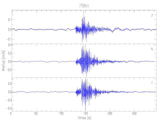 Los registros de velocidad se obtienen de la integración de los datos de aceleración. Esta tabla contiene los valores de velocidad máxima (PGV por sus siglas en inglés) para cada componente en cm/s. Las estaciones se listan en orden alfabético y corresponden a los sitios en que el nivel de aceleración fue superior a los 5 cm/s2.