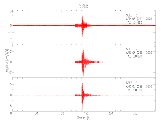 La siguiente tabla muestra los datos de aceleración máxima para cada componente en porcentaje de la aceleración de la gravedad (%g). Estos se obtienen dividiendo el valor del PGA registrado por 980 cm/s2 y multiplicándolo por 100. Las estaciones se listan en orden alfabético. Los valores de las últimas dos columnas corresponden a la componente radial y transversal.