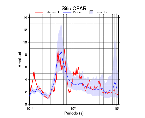 Los resultados que se presentan aquí fueron obtenidos luego de dividir las componentes horizontales entre la componente vertical (conocido como técnica H/V). Se grafica tanto el efecto de sitio del sismo registrado como el valor promedio en cada estación y su correspondiente desviación estándar.