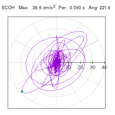 Tomando el periodo en el cual se presenta la amplitud máxima del espectro de respuesta máxima para cada estación, se representa la respuesta bidireccional en función del tiempo sobre el plano horizontal. Se identifica el punto (color verde en cada figura) del cual se desprende la orientación mostrada en el mapa de la sección superior. El valor de la acelereración máxima corresponde al punto del espectro de respuesta para el periodo indicado.