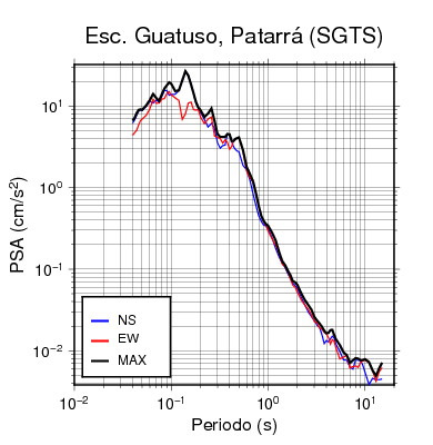 En los siguientes gráficos, la traza verde es el espectro propuesto por el CSCR-2010, la traza negra es el espectro máximo de este sismo. El valor de la amplitud está dado en pseudoaceleración en cm/s2.