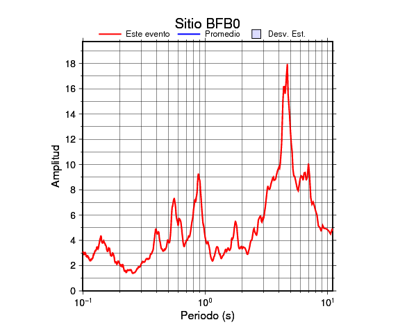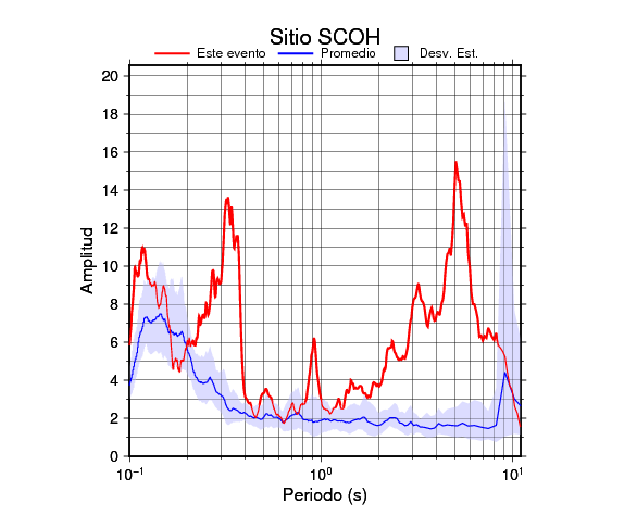 Los resultados que se presentan aquí fueron obtenidos luego de dividir las componentes horizontales entre la componente vertical (conocido como técnica H/V). Se grafica tanto el efecto de sitio del sismo registrado como el valor promedio en cada estación y su correspondiente desviación estándar.