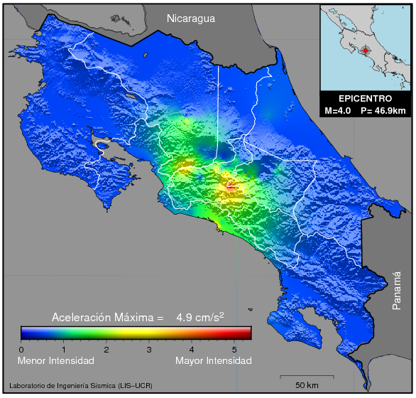 Los datos de aceleración máxima registrada se interpolan para obtener un mapa de isoaceleraciones. En el se puede ver la tendencia general de la amplificación de todo el país a partir del lugar en que el movimiento fue más intenso.