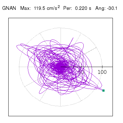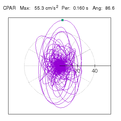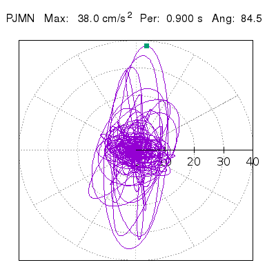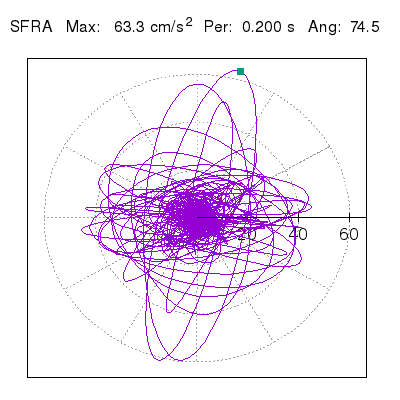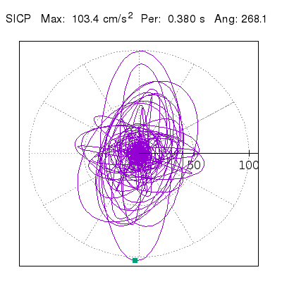 Tomando el periodo en el cual se presenta la amplitud máxima del espectro de respuesta máxima para cada estación, se representa la respuesta bidireccional en función del tiempo sobre el plano horizontal. Se identifica el punto (color verde en cada figura) del cual se desprende la orientación mostrada en el mapa de la sección superior. El valor de la acelereración máxima corresponde al punto del espectro de respuesta para el periodo indicado.