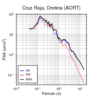 Los espectros de respuesta máxima siempre serán mayores o iguales a los espectros en las direcciones N-S y E-O. Se muestra la comparación para cada una de las estaciones en que se registró el evento.