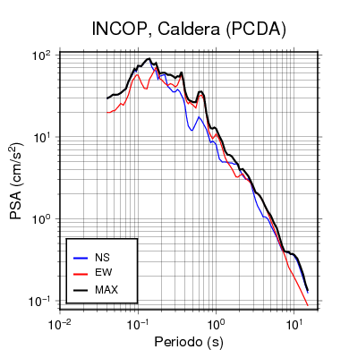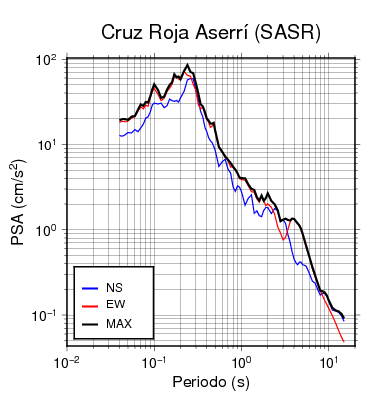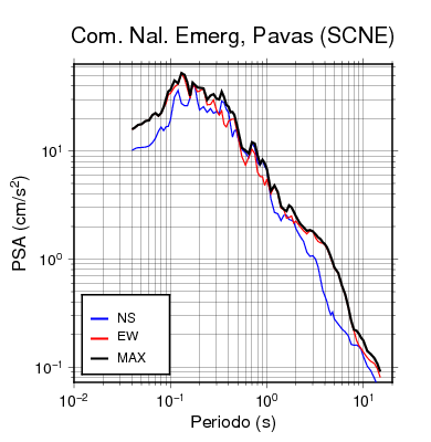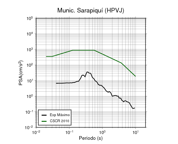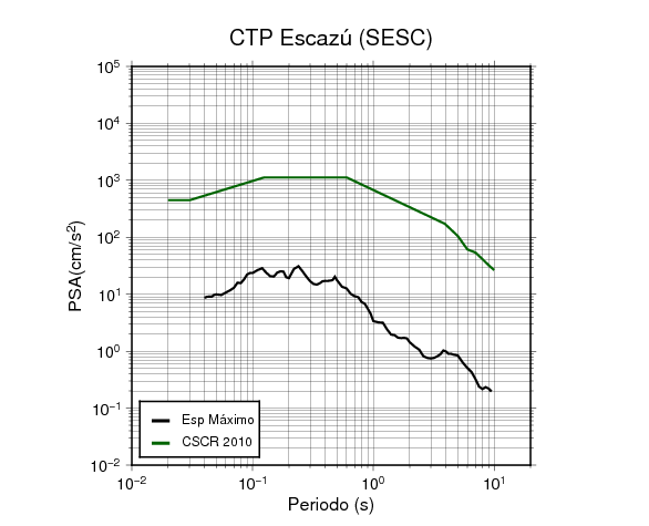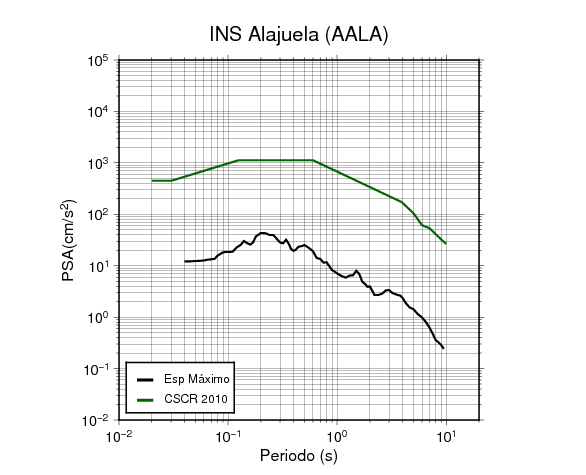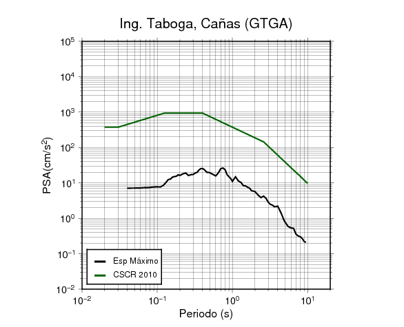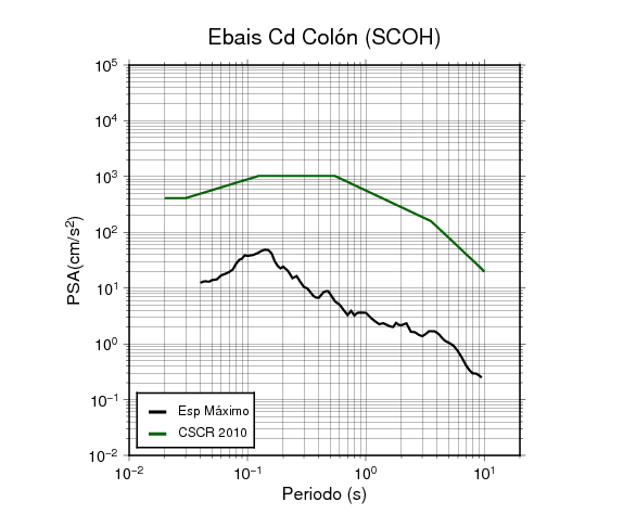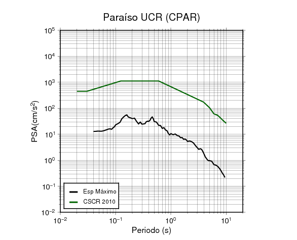 En los siguientes gráficos, la traza verde es el espectro propuesto por el CSCR-2010, la traza negra es el espectro máximo de este sismo. El valor de la amplitud está dado en pseudoaceleración en cm/s2.