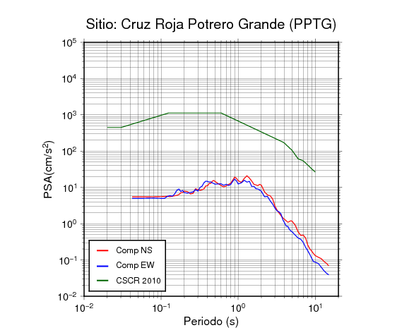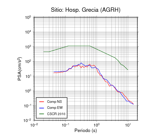 En los siguientes gráficos, la traza verde es el espectro propuesto por el CSCR-2010, la traza roja es el espectro de este sismo en la componente norte-sur (NS) y la traza azul la componente este-oeste (EW). El valor de la amplitud está dado en pseudoaceleración en cm/s2.