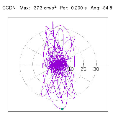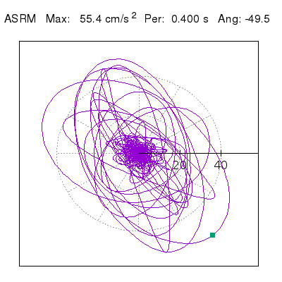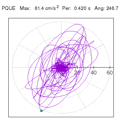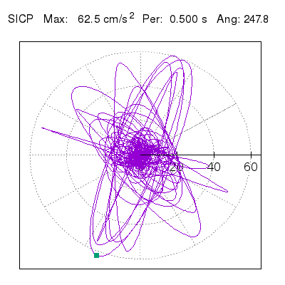 Tomando el periodo en el cual se presenta la amplitud máxima del espectro de respuesta máxima para cada estación, se representa la respuesta bidireccional en función del tiempo sobre el plano horizontal. Se identifica el punto (color verde en cada figura) del cual se desprende la orientación mostrada en el mapa de la sección superior. El valor de la acelereración máxima corresponde al punto del espectro de respuesta para el periodo indicado.